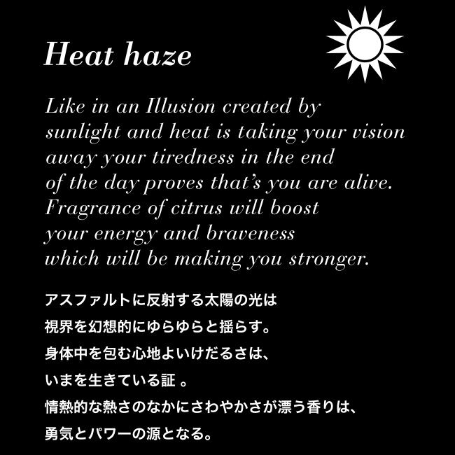 アスファルトに反射する太陽の光は視界を幻想的にゆらゆらと揺らす。身体中を包む心地よいけだるさは、いまを生きている証。情熱的な熱さのなかに、レモンライムのさわやかさが漂うフレーバーは、勇気とパワーの源となる。