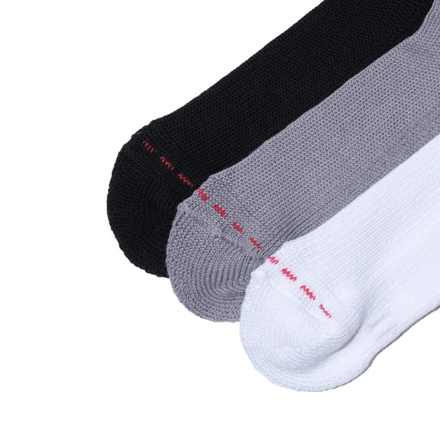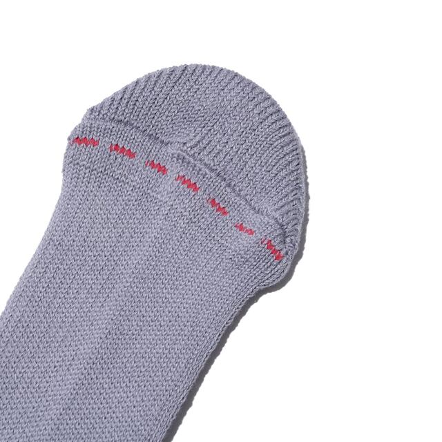 快適なスニーカーライフを提供するMARQUEE PLAYER(マーキープレイヤー)が履き心地とシルエットをこだわり抜いたクォーター丈のリブソックス。生産は、デザインと機能の調和を考え、医療・スポーツ系ソックスの技術を駆使して履き心地を追求した日本製のソックスブランドFAB.IT(ファブイット)に依頼。手編みのようなソフトな風合いの出るローゲージパイル機で丁寧に編み立てつつ、部分毎に編み方を変えることで程よいルーズさとスマートなシルエットを両立した完全オリジナルデザイン。履き口部分に特殊なリッチェル編みを採用。伸縮性に富み、締め付け感が少なく、柔らかな肌触りが魅力。足甲にはゴムを入れてスポーティなフィット感を生み出し、踵を立体的に編み立てることで足のホールド感が増し安定した履き心地を実現。また、肉厚パイルで仕立てた足底が優れたクッション性と吸水性を発揮するとともに足への負担を軽減します。医療とスポーツの技術を混合させ、極上の履き心地とスニーカーとの相性が抜群なクォーター丈に仕上げた自信作。本作は刺し子の伝統的な模様から着想を得て、つま先部分に施した赤いステッチのコントラストが、さりげないアクセントを添えています。カラーはホワイト、グレー、ブラックの3色で展開する『ミタスニーカーズ』が別注したエクスクルーシブアイテム。