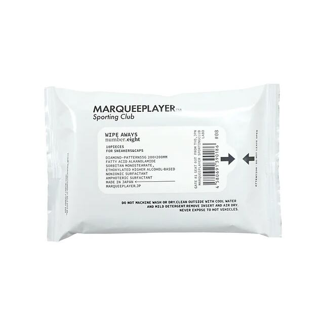 本製品は、クリーニング業者の老舗が監修をした、環境、素材、肌にも配慮した次世代型のナチュラル思考合成洗剤を、スニーカーだけでなく、キャップにも使用できるようにアレンジした特別な洗剤をクロスに浸透させたウエットシートタイプのクリーナーです。 使用しているクロス(シート)は、ダイヤ柄にパターン加工したクロスを採用し、より汚れを吸着させやすいように配慮。 効率的にスニーカーケアができるような構造に仕上げました。 1枚のクロス(シート)サイズは、大判の200 x 200mmあり、1枚でスニーカーは1足、キャップは2個が十分にケアできるサイズです。 スニーカーだけでなく、キャップもケア出来る様にアレンジさせた事は、MARQUEE PLAYERらしく痒い所に手が届くよう配慮したポイント。